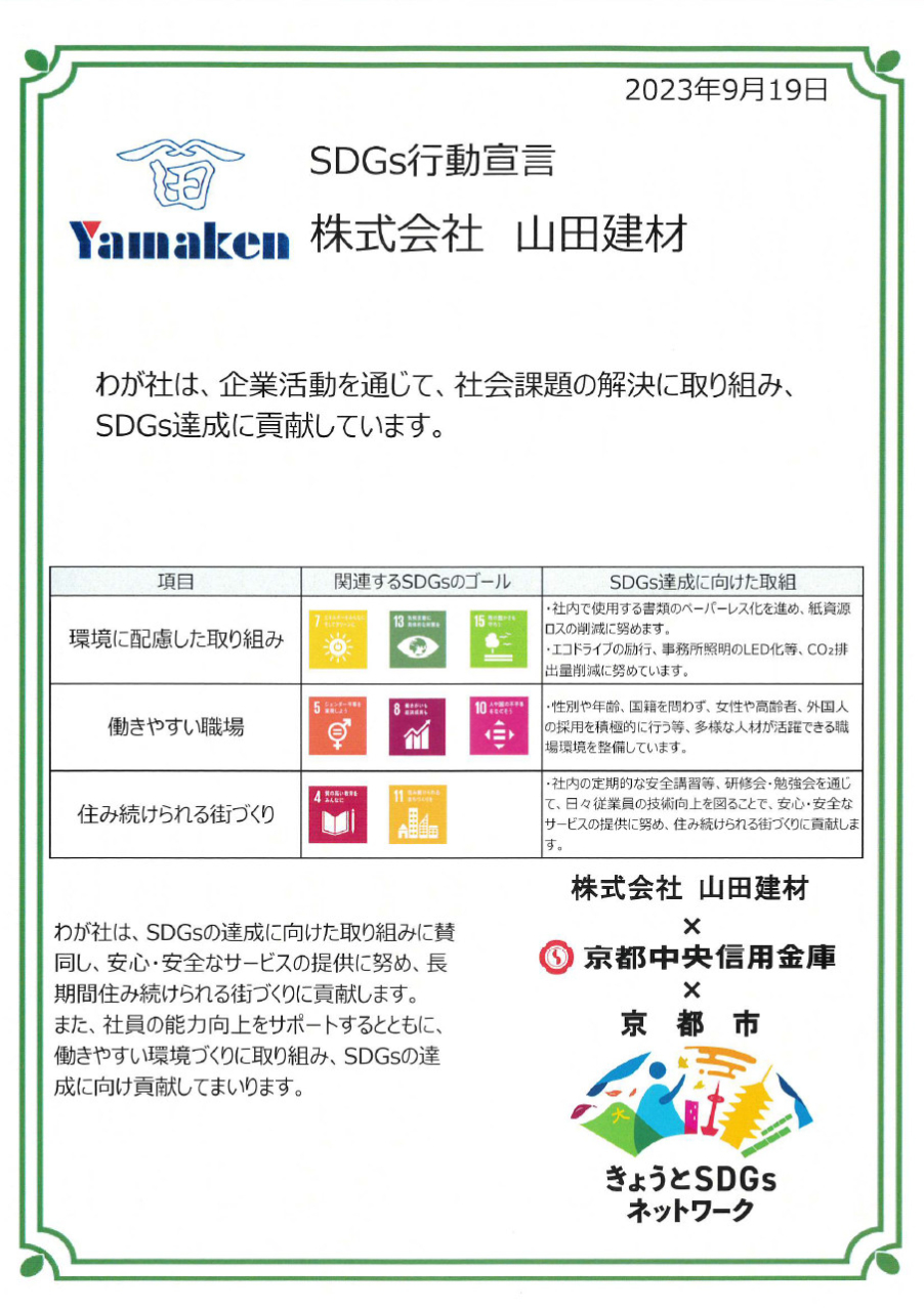 株式会社 山田建材は、SDGsの達成に向けた取り組みに賛同し、安心・安全なサービスの提供に努め、長期間住み続けられる街づくりに貢献します。